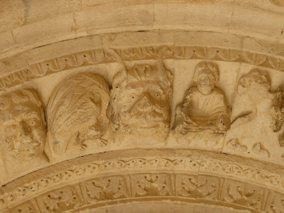 En otra arquivolta más interior se suceden figuras humanas, animales y fantásticas en aparente desorden. Parecen lo que sigue, de izquierda a derecha: